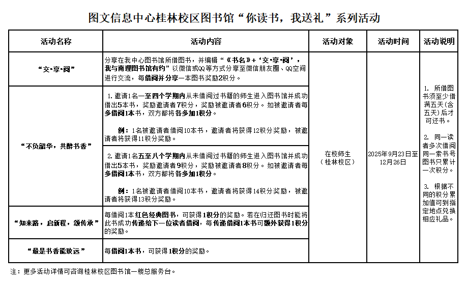 在校师生: 为大力推动校园文化建设进程,营造积极向上的校园文化氛围,同时充分发挥图书馆文化阵地作用,引导更多的师生主动走进图书馆,多读书,读好书,以书会友,共同品味书香带来的感动与感悟,并让阅读成为一种习惯,图文信息中心将于本学期继续开展“书香买球”系列之“你读书,我送礼”系列活动,具体活动内容如下: