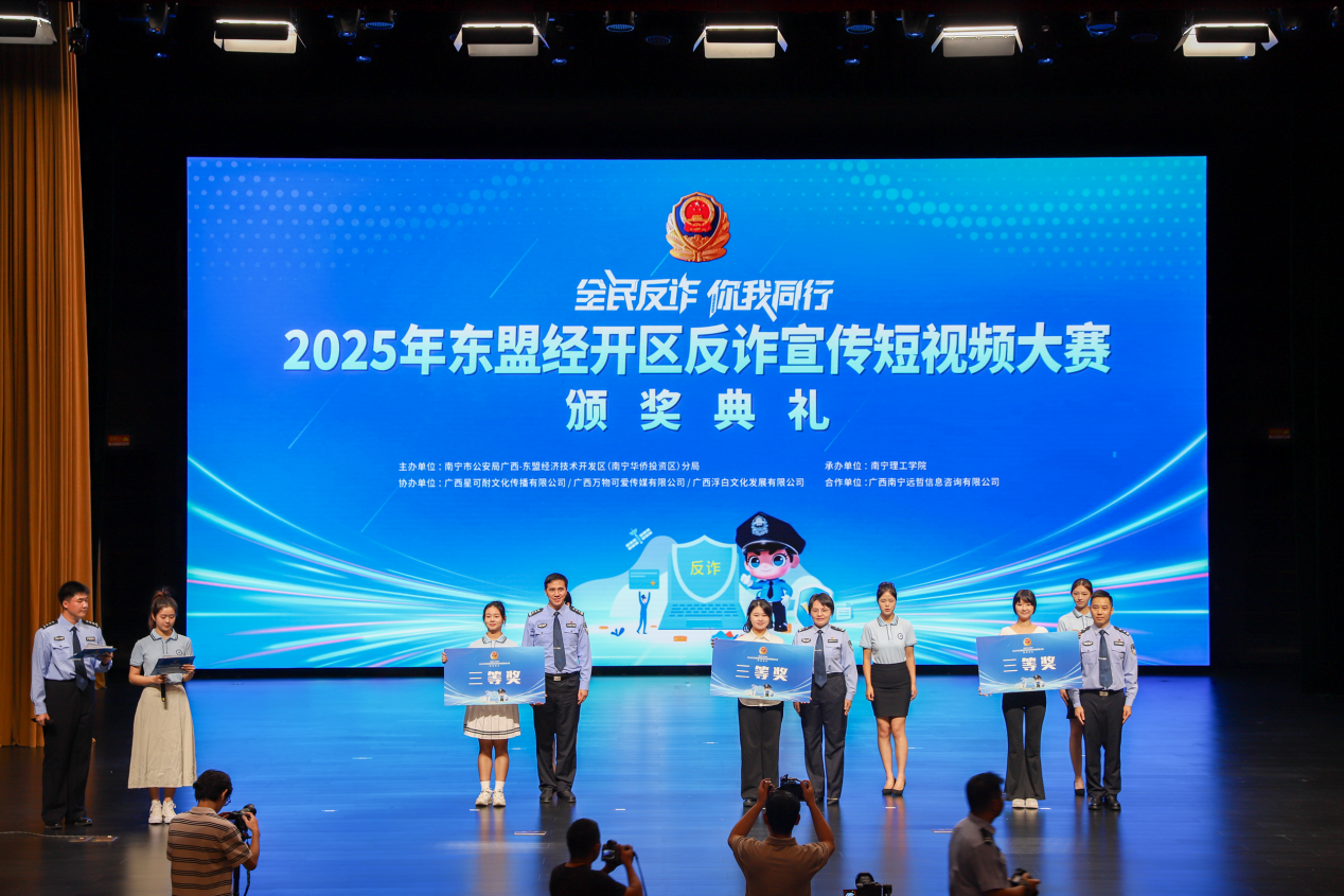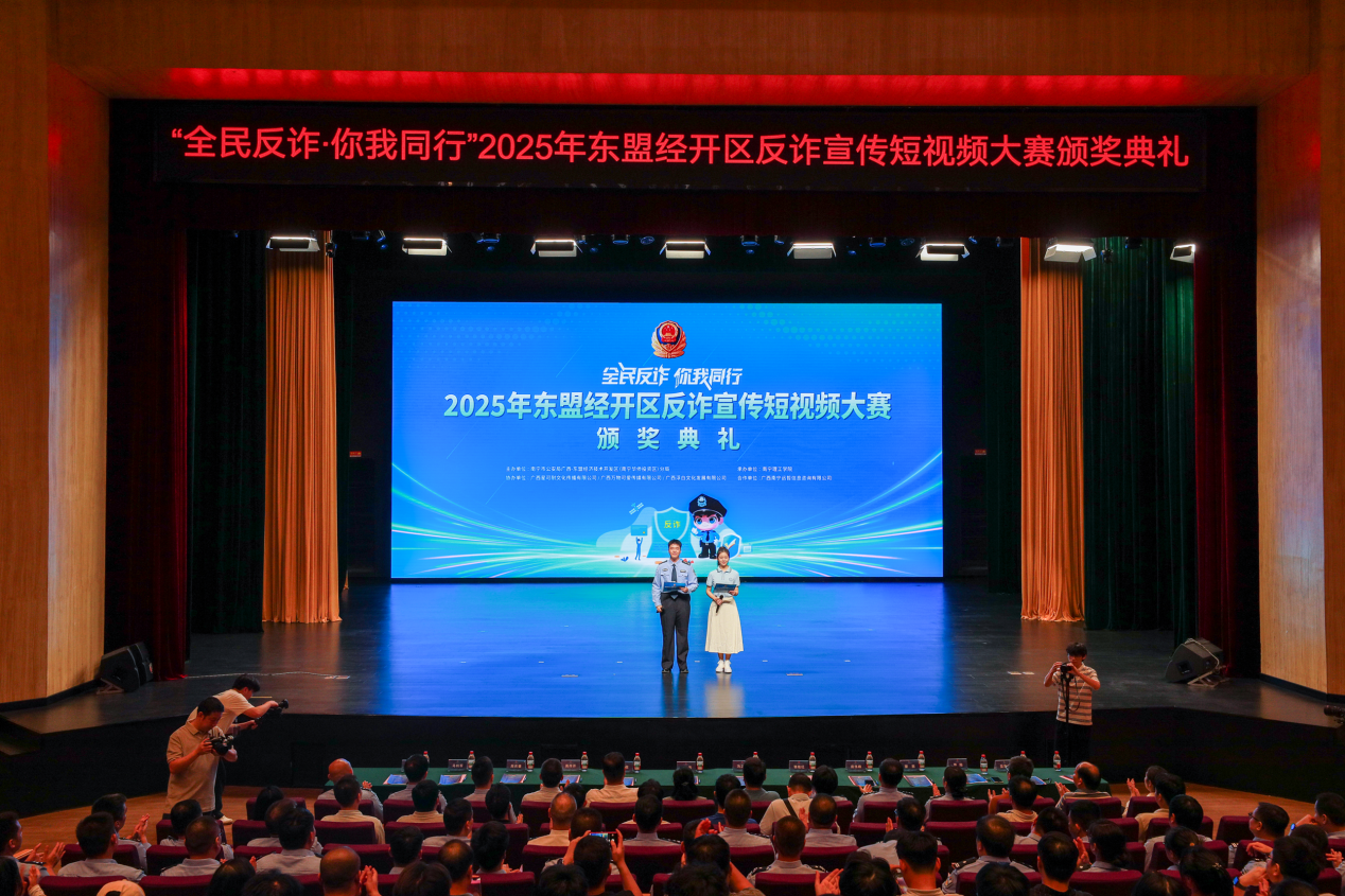 10月16日晚,由广西壮族自治区公安厅东盟经开区分局主办、买球官方网站承办的“全民反诈 你我同行”2025年东盟经开区反诈宣传短视频大赛颁奖晚会在学校东盟大剧院举行。民警、师生代表600余名共上一堂别开生面的“反诈公开课”。