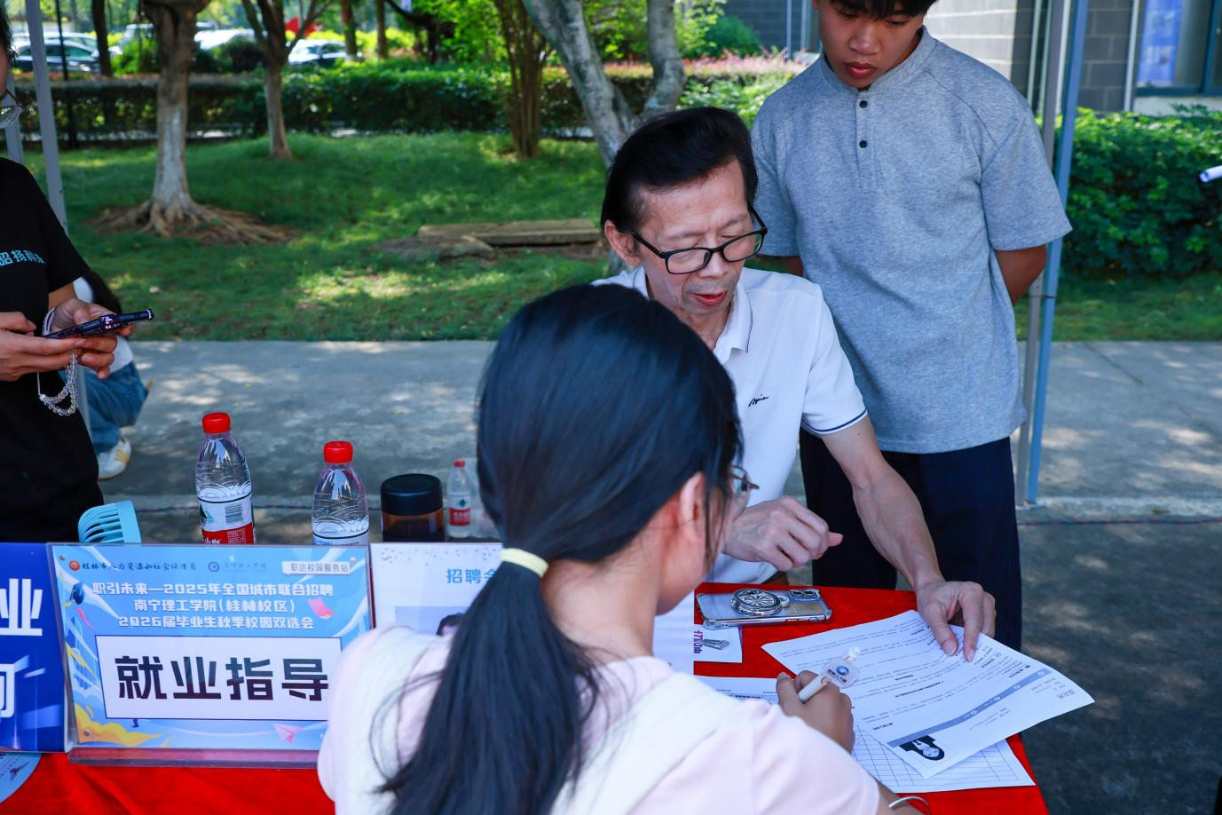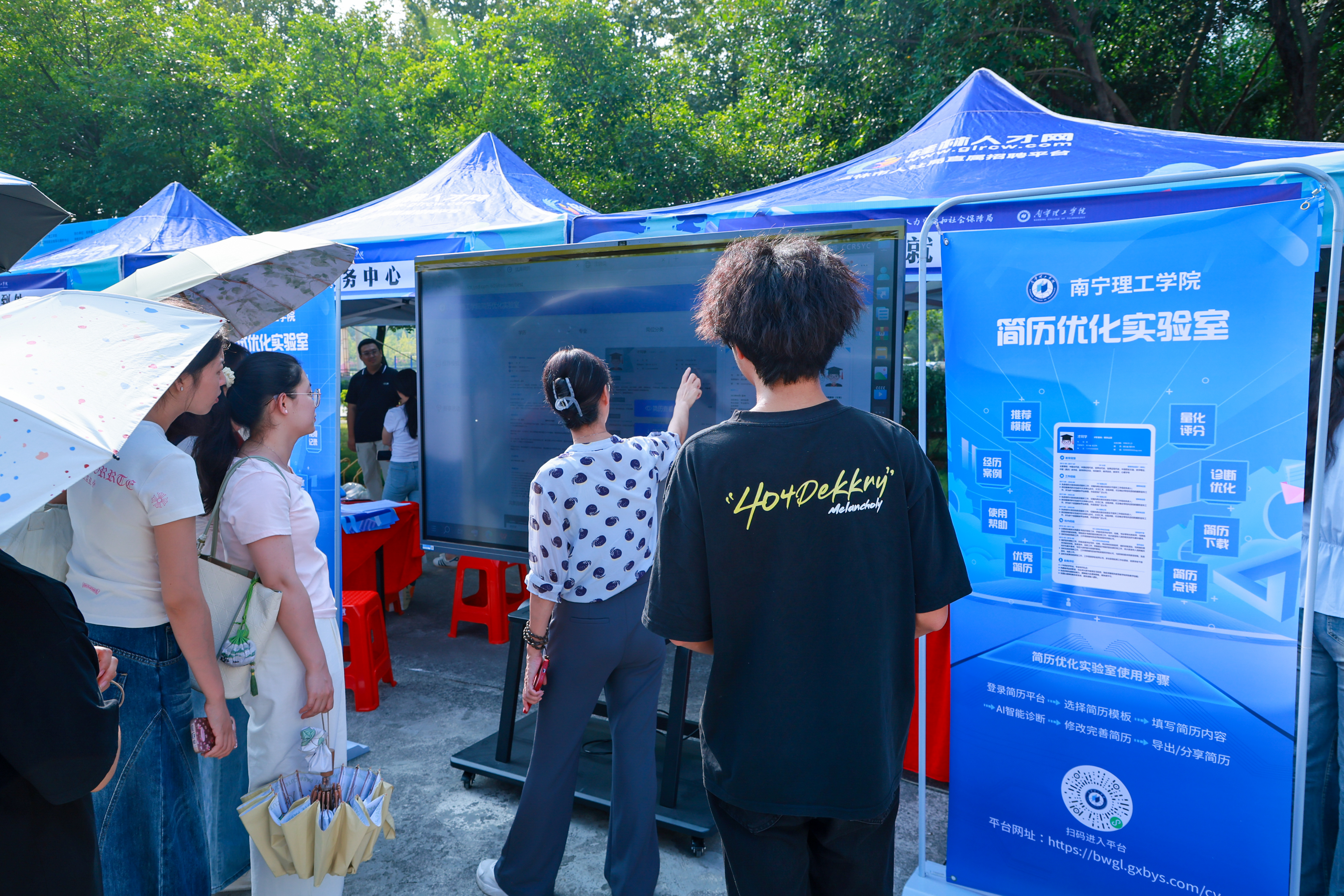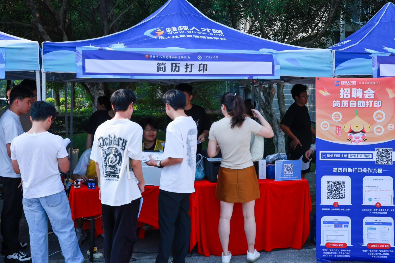 双选会以“全方位就业支持”为核心,设置五大专属服务区域,为学生提供“从简历到职业规划”的全链条帮扶。简历打印区现场提供自助免费打印服务,学生注册桂林人才网并完善简历后即可便捷打印,解决求职“最后一公里”难题;就业指导区邀请资深就业指导专家坐阵,开展“一对一”咨询服务,针对职业定位、简历优化、面试技巧等问题精准解答,帮助学生明晰就业方向;政策宣传区由人才政策专家现场解读就业补贴、人才引进等政策,引导学生把握政策红利;AI就业赋能区成为现场“热门打卡点”,通过AI面试模拟系统让学生沉浸式体验面试场景,同时提供简历智能优化、岗位精准匹配服务,助力学生提升求职竞争力;参军入伍咨询区咨询人数超150人,工作人员详细介绍征兵政策、入伍流程及优抚待遇,激发学生参军报国热情。