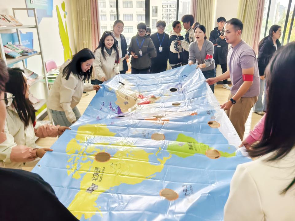 活动过程中,全体辅导员分成小组依次参与了“四平八稳”“环游世界”“全球攻势”三项趣味竞技项目。在“四平八稳”环节,队员们需依次循环使用道具板托举球通过障碍赛道,考验的是耐心与平衡感;稍有不慎球体掉落,便需返回起点重新开始,但辅导员们始终保持着高度的专注与默契,一次次化险为夷,展现出顽强的拼搏精神。随后的“环游世界”环节则模拟“球行地图”的趣味任务,队员们需精准控制球的轨迹,避免中途掉落,这不仅考验操作技巧,更需策略分工与及时补位。最后的“全球攻势”将活动推向高潮,每位辅导员轮流投球击倒球瓶,现场气氛紧张热烈,每一次精准命中都引来阵阵欢呼。