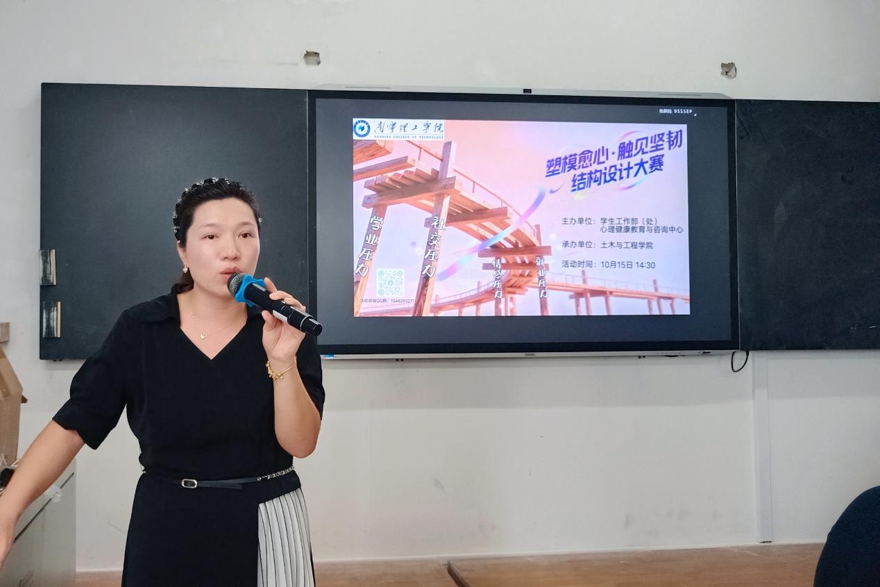 2025年10月15日下午,由学生工作部(处)心理健康教育与咨询中心主办、土木与工程学院承办的“塑模愈心·触见坚韧”结构设计大赛在一教1307教室顺利举行。本次活动将结构设计与心理健康教育深度融合,以“工程实践+心理实验”的双模块闯关形式,引导学生在动手实践中感悟心理韧性,提升压力管理能力。