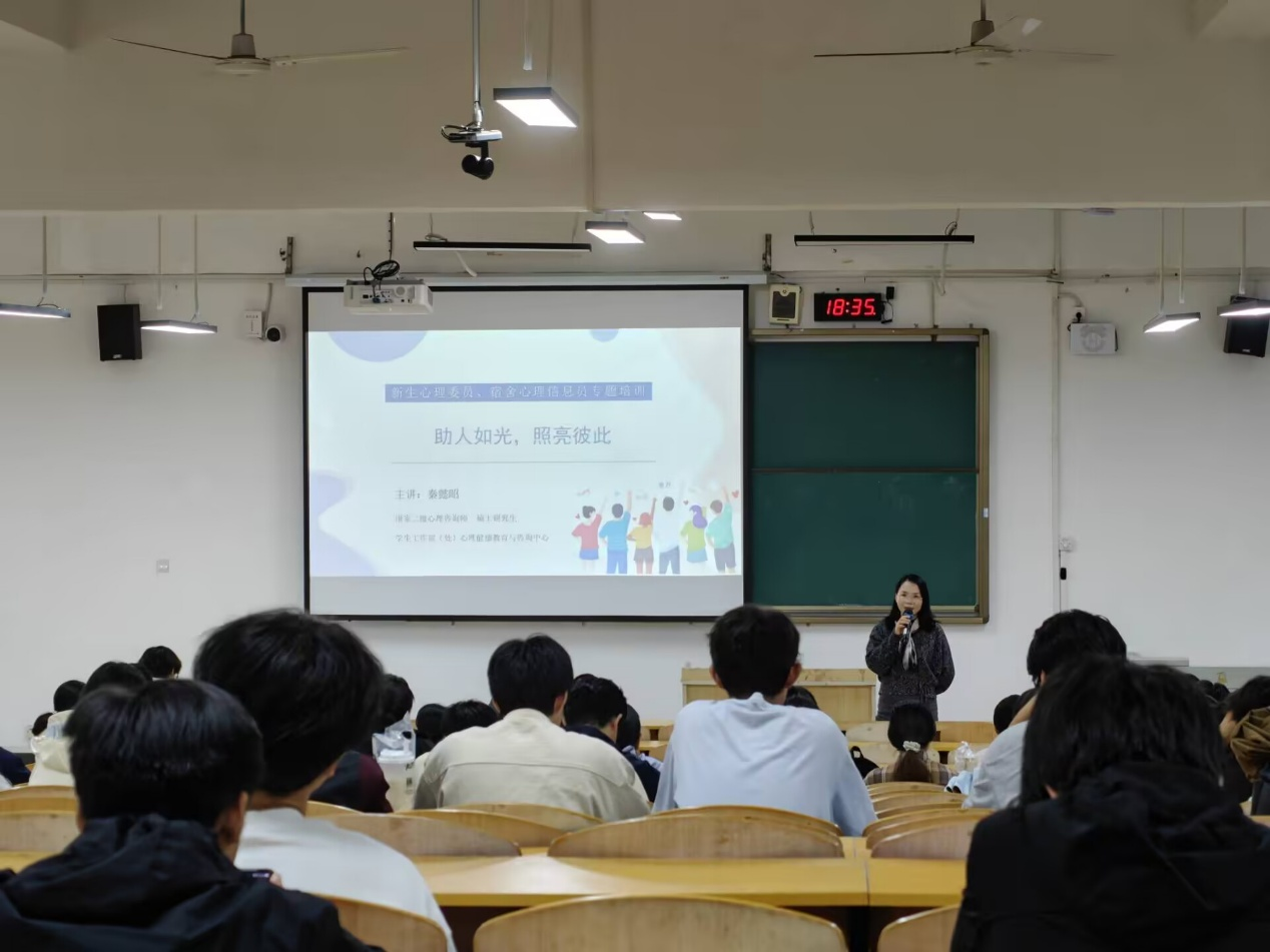 为强化“学校-学院-班级-宿舍”四级心理预防干预工作机制,加强心理委员队伍建设,提升相关人员专业素养与工作能力,助力同学们做好大学期间心理调适,2025年11月7日晚,心理健康教育与咨询中心开展“助人如光,照亮彼此”专题培训,面向全体新生心理委员及宿舍心理信息员开展系统指导。