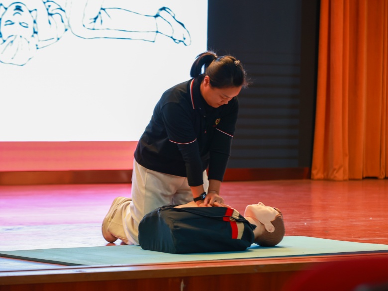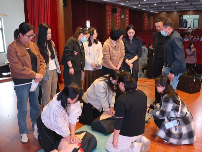 理论讲解与演示结束后,培训进入了至关重要的实操演练环节。报告厅内设置了多个模拟人教具,参训的教职工们热情高涨,纷纷主动上前,在讲师团队一对一的指导下,进行沉浸式体验。