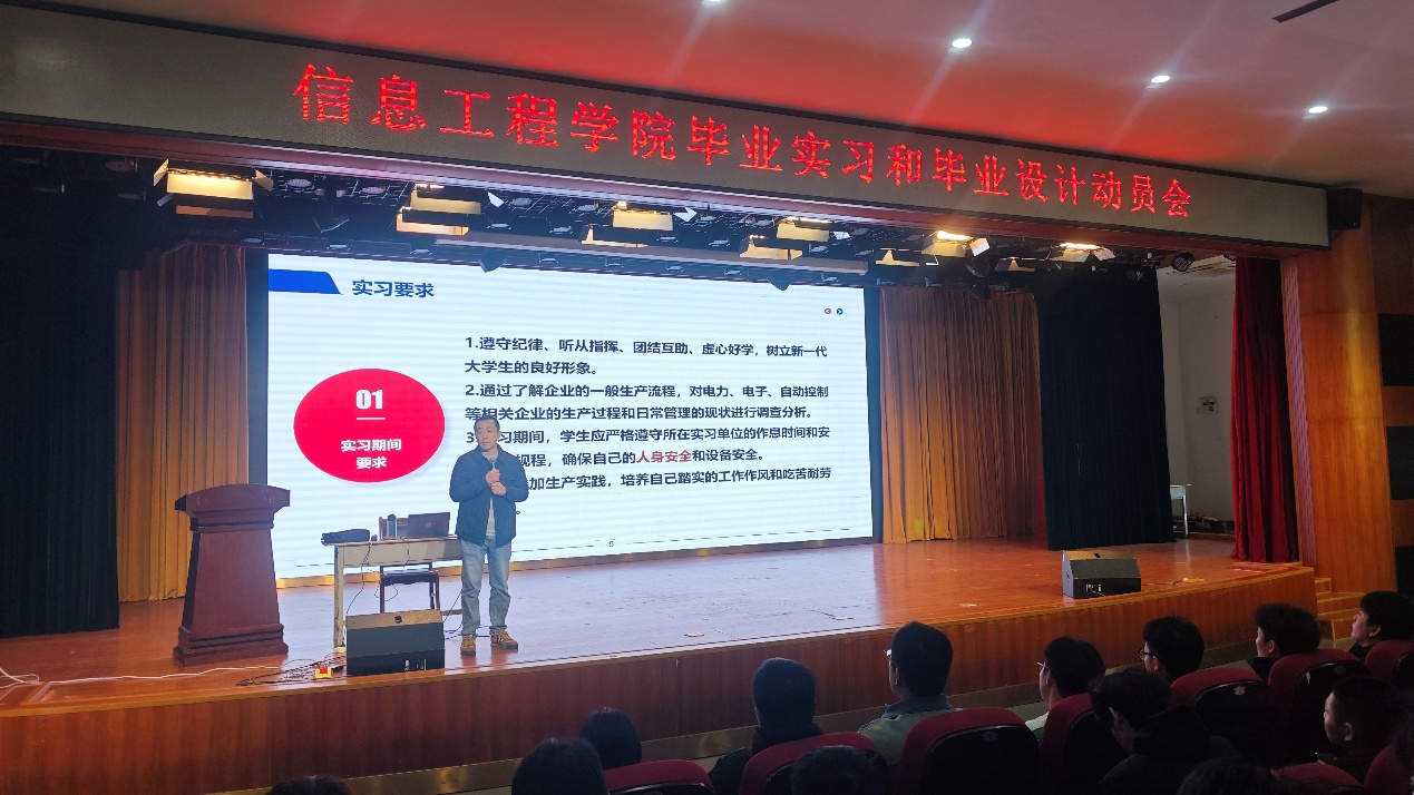 2025年11月19日,信息工程学院电气教研室在1626报告厅成功召开了2026届毕业生(专升本)毕业实习与毕业设计动员宣讲会。会议由电气教研室主任闫世伟主持,电气教研室全体专任教师及2026届电气工程及其自动化专业(专升本)全体毕业生共同参加。本次会议旨在帮助毕业生明确就业方向,增强安全意识,系统解读毕业实习与毕业设计(论文)的各项流程与关键要求。