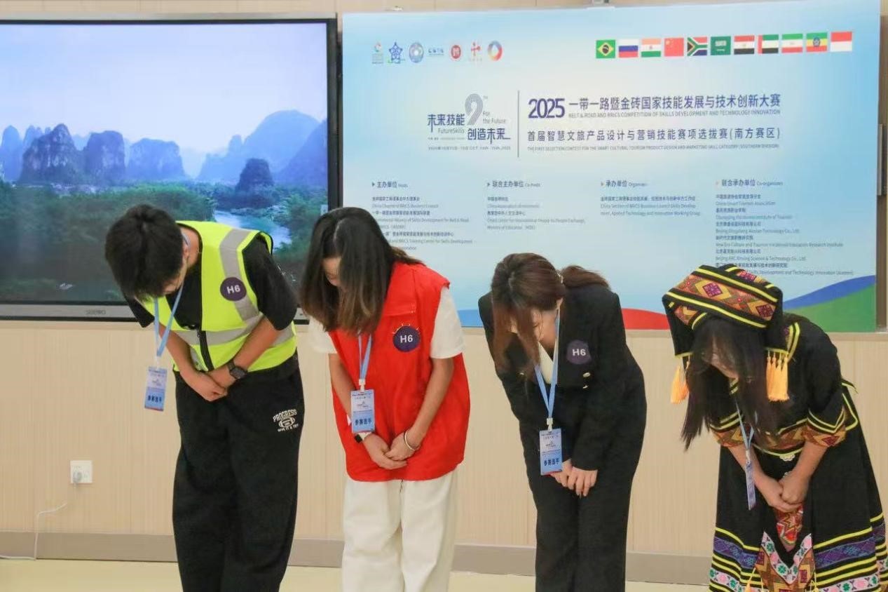 2025年10月13日至16日,在买球官方网站数字经济产业学院的支持下,商学院选派两支学生代表队,共计8名选手,在囤荣立、唐莉琼两位教师的带领下,前往重庆黔江参加2025“一带一路”暨金砖国家技能发展与技术创新大赛(以下简称“金砖大赛”)旅游赛项。本次大赛由金砖国家工商理事会、“一带一路”国际技能发展联盟主办,重庆旅游学院承办。