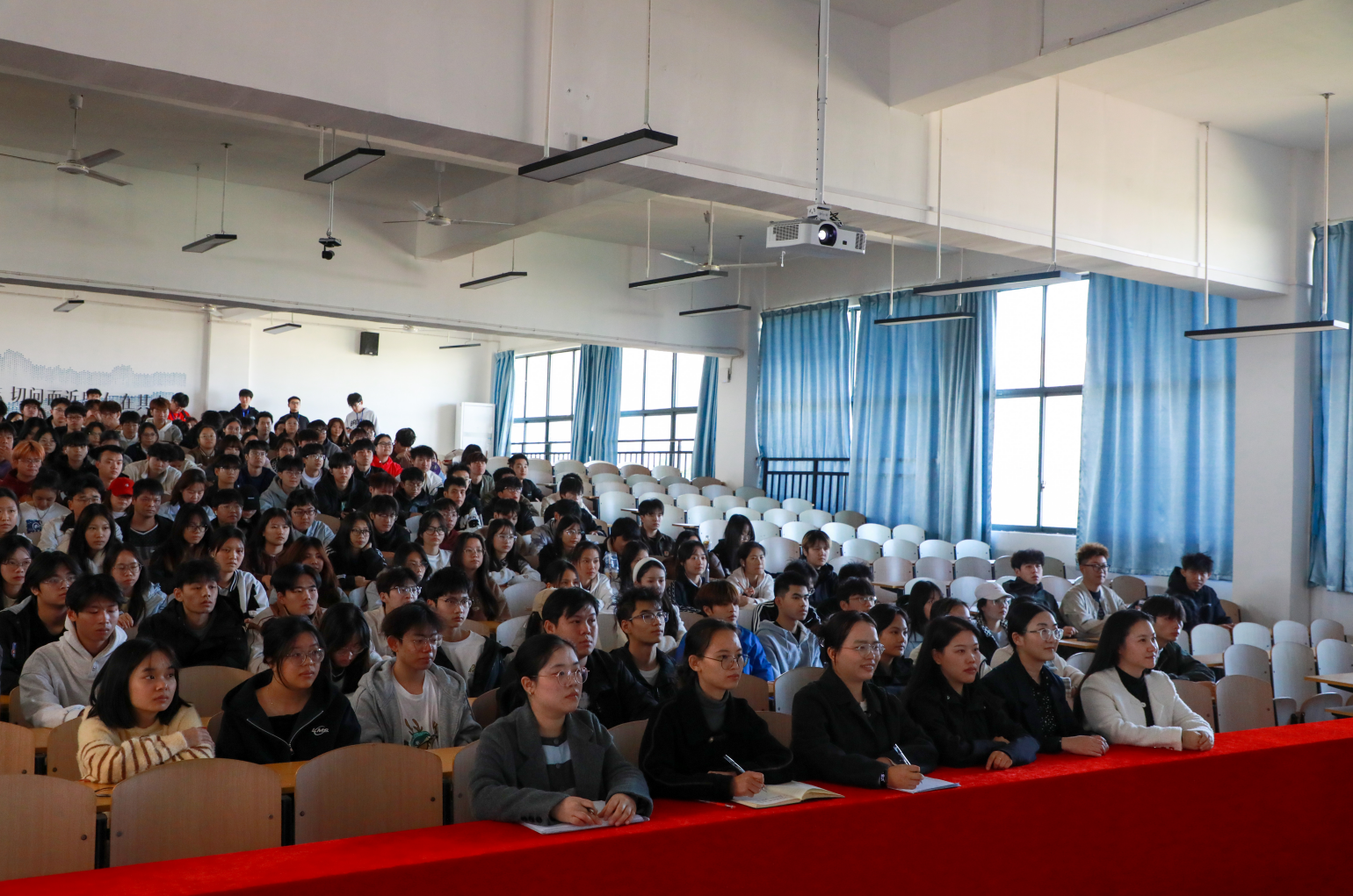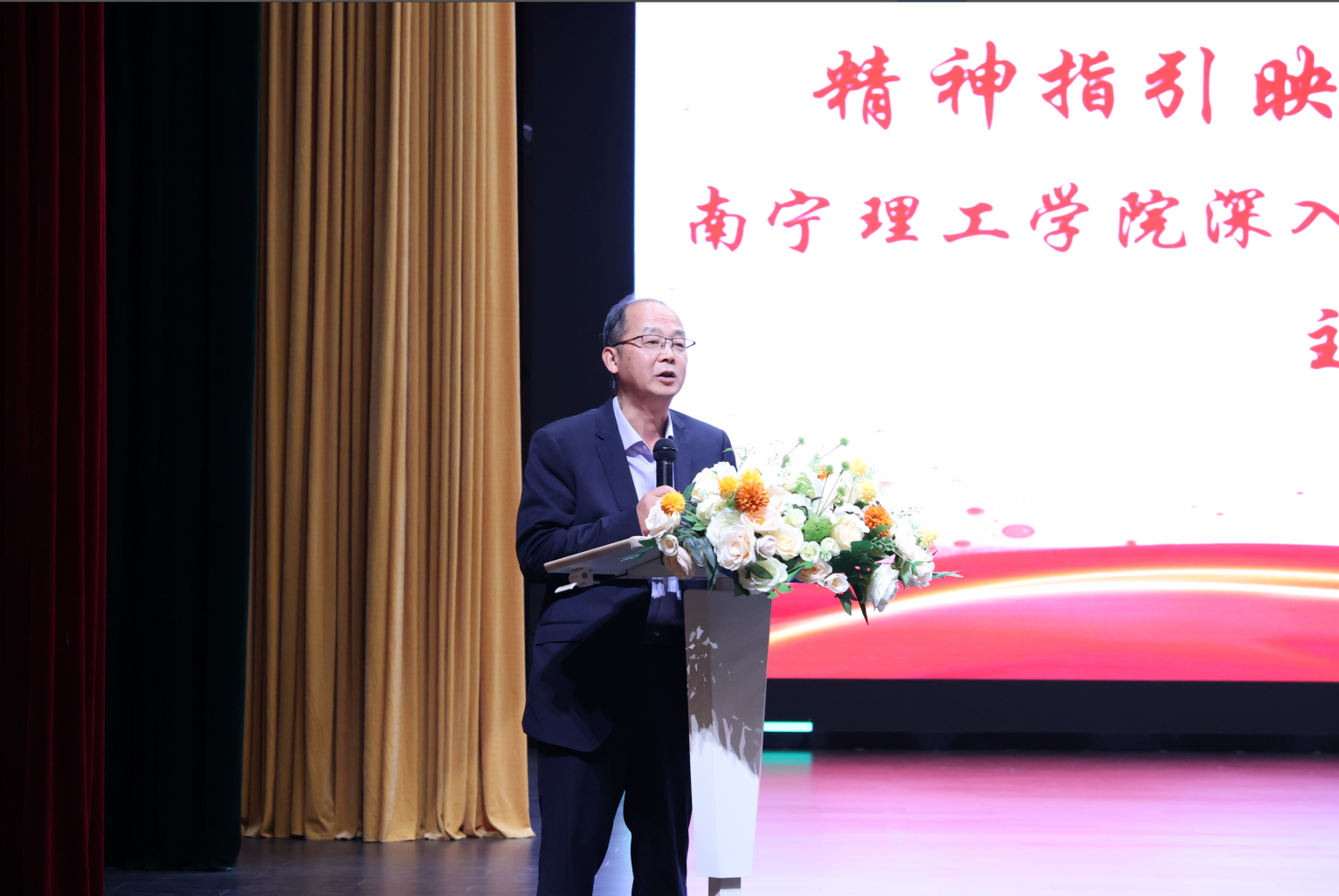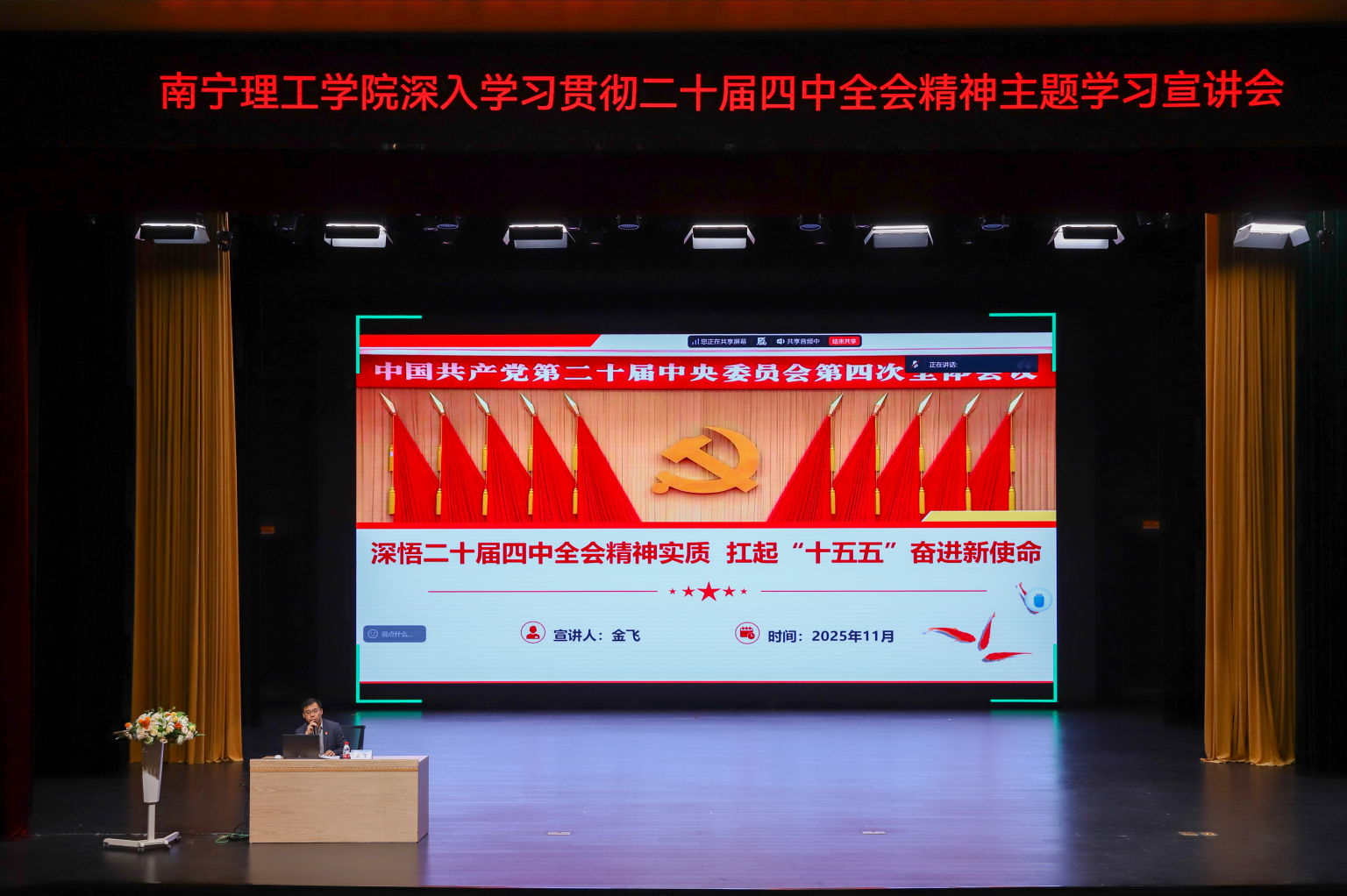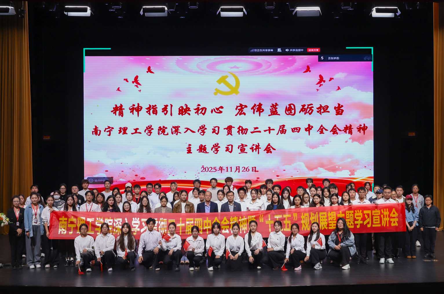 2025年11月26日,“精神指引映初心 宏伟蓝图砺担当”买球官方网站深入学习贯彻二十届四中全会精神主题学习宣讲会在南宁校区东盟大剧院主会场与桂林校区4501分会场同步举行。