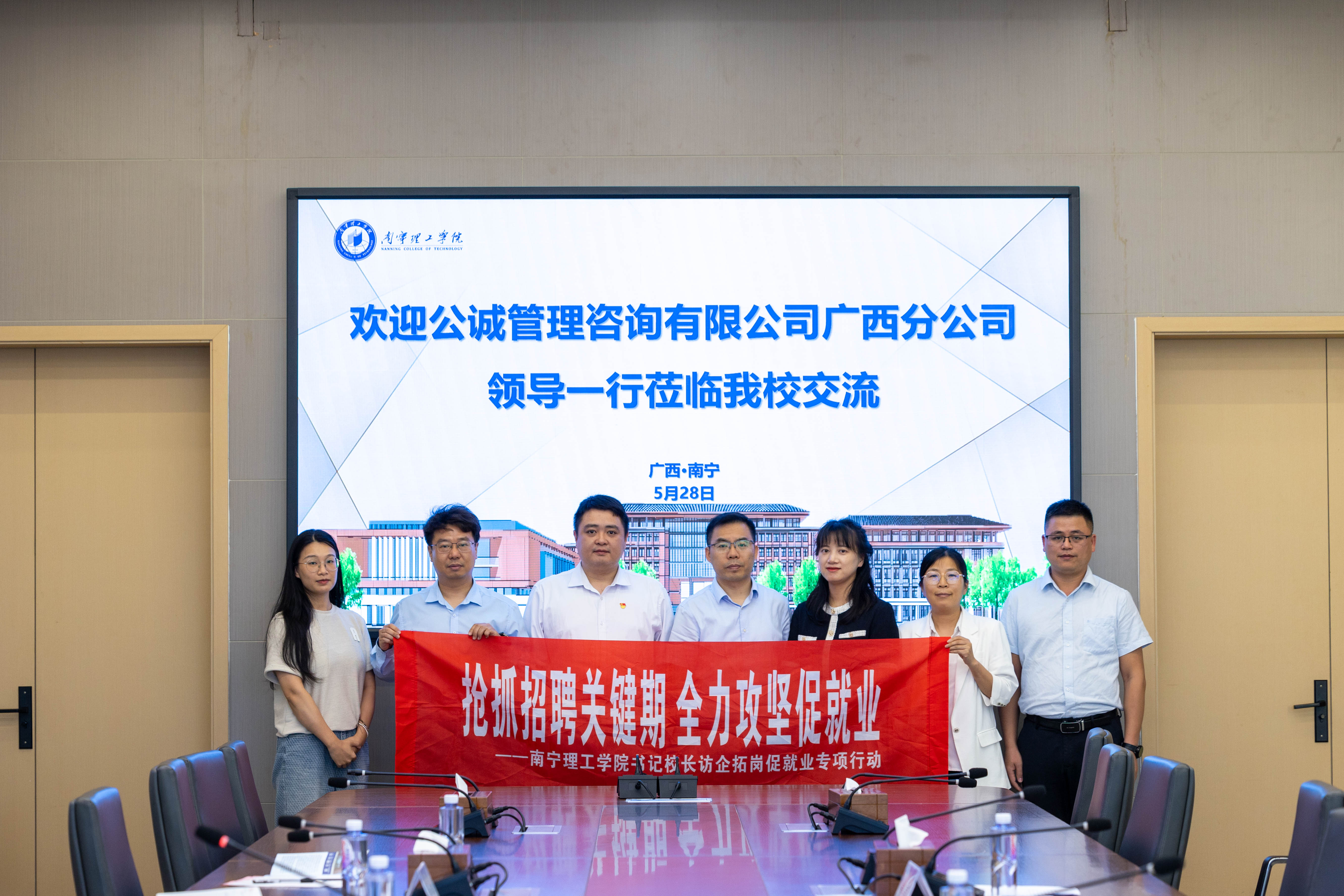 5月28日,买球官方网站与公诚管理咨询有限公司广西分公司校企合作洽谈会暨校企合作签约仪式在南宁东盟校区619会议室顺利召开。学校党委书记金飞,土木与工程学院院长鲁金金、党总支书记秦磊等校方代表,公诚管理咨询有限公司广西分公司党支部书记兼总经理谭浩淼、综合服务中心经理刘萍、人力专员陈微等企业方代表等人出席会议,双方就深化校企合作展开深入交流。旨在为学校、企业双方搭建合作桥梁,探索人才培养与产业发展融合路径。