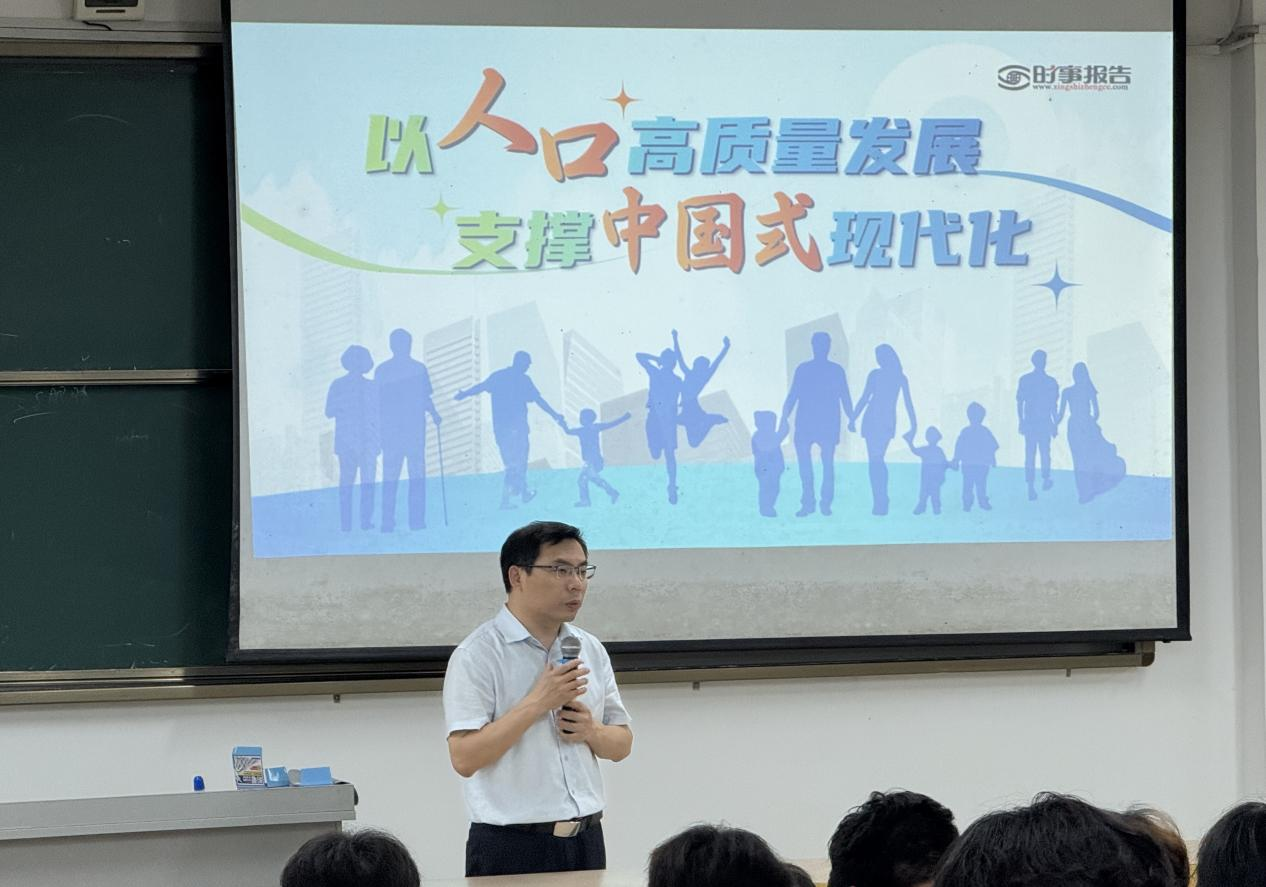 校党委书记金飞从中国式现代化全局出发,深入解读了人口安全与总体国家安全的密切联系,全面分析了当前我国人口发展面临的新形势和新挑战,阐明了“要以人口高质量发展促进经济社会高质量发展”的紧迫性,并强调:大学生作为中国式现代化的生力军,要增强学习本领,提高自身综合素质,更好地服务于社会主义现代化建设事业。
