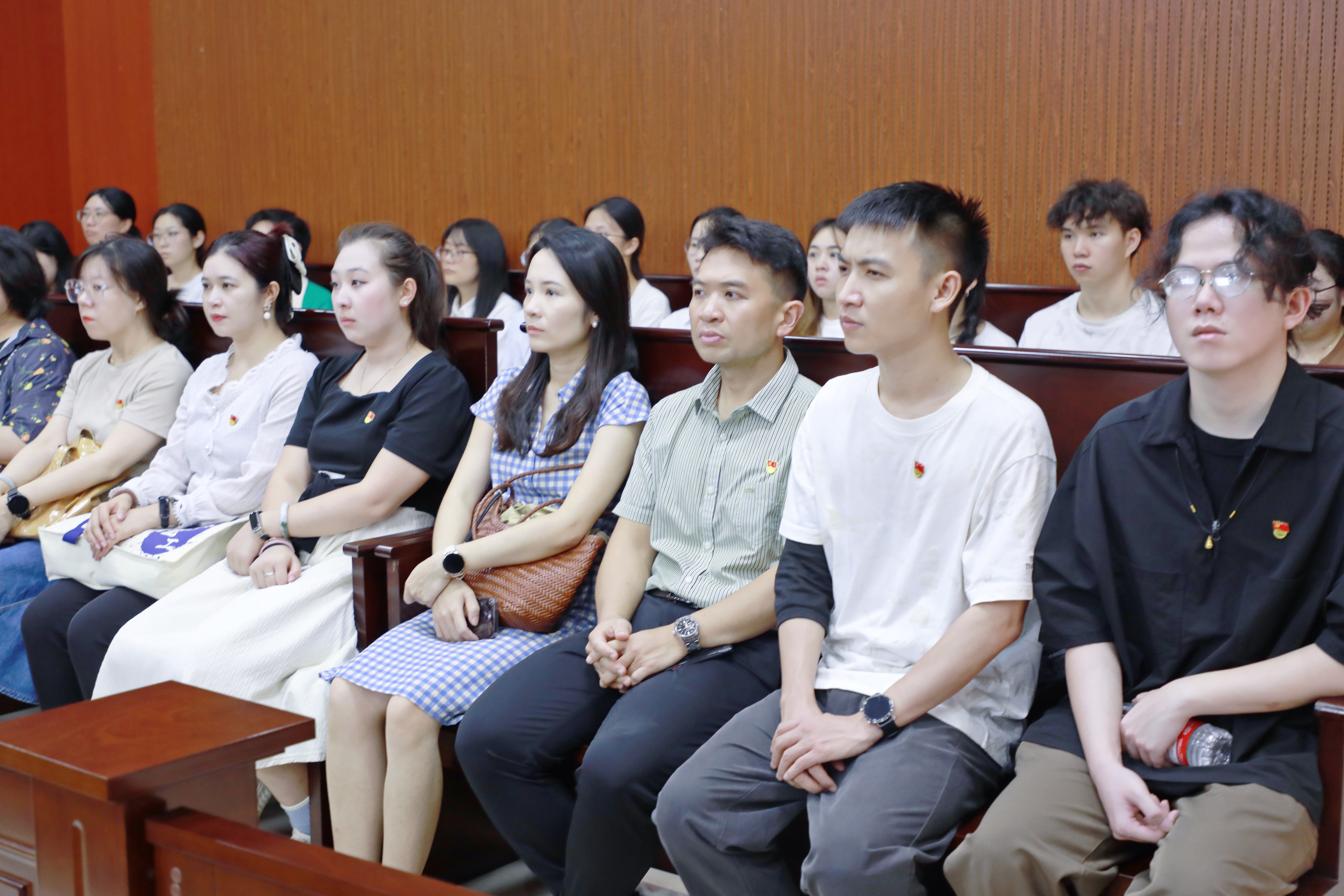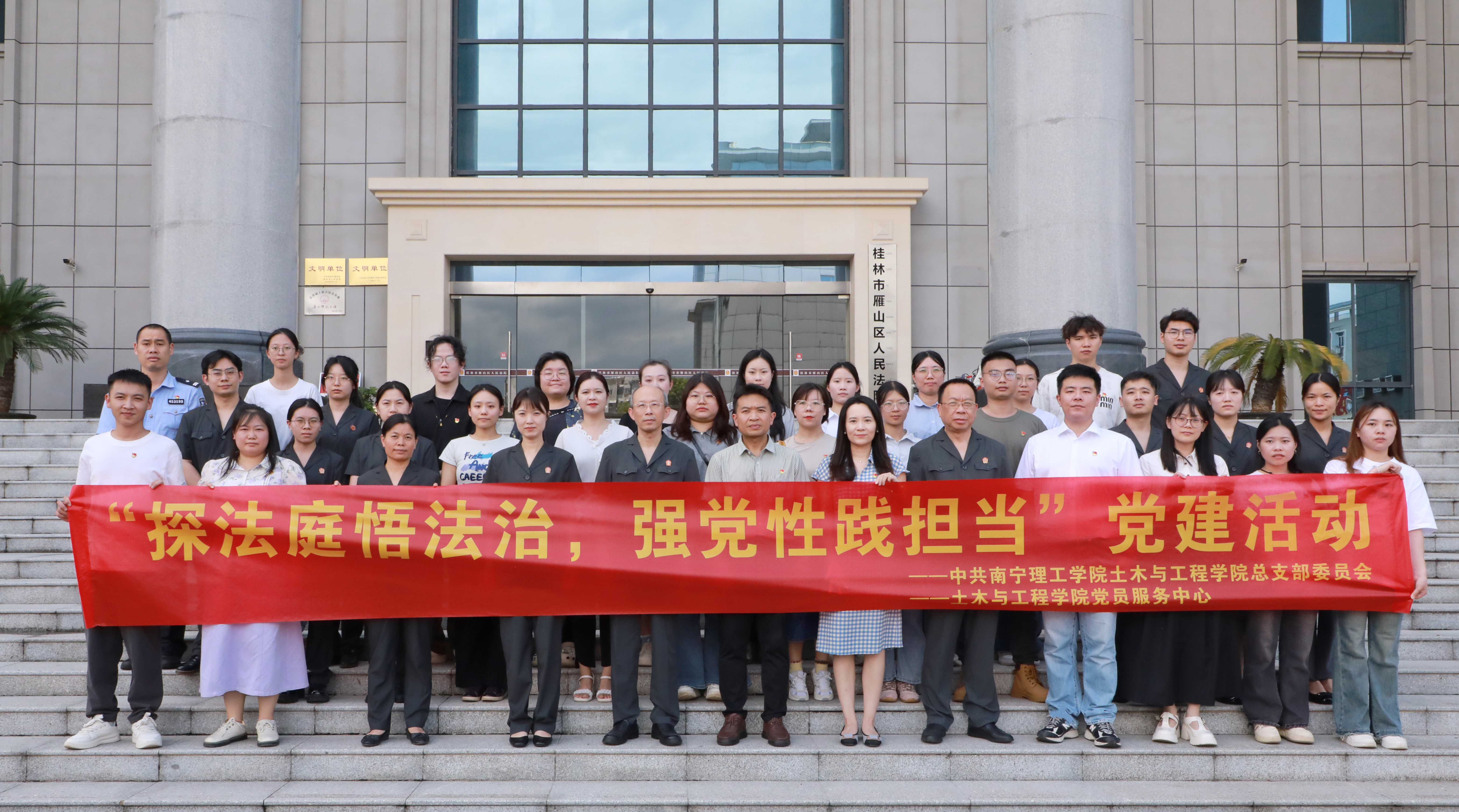 为深入贯彻习近平法治思想,全面落实依法治国战略,扎实推进《关于加强社会主义法治文化建设的意见》相关部署,6 月 25 日,土木与工程学院党总支精心组织师生前往桂林市雁山区人民法院,开展了一场意义深远的党建联建观摩学习活动。学校党委组织部部长兰渝宗、宣传部副部长孔晓薇、土工学院党总支书记助理杨笑宇,以及学院各党支部党员师生、党员服务中心学生代表踊跃参与,借助沉浸式法治实践,让法治理念深深扎根于师生心中。