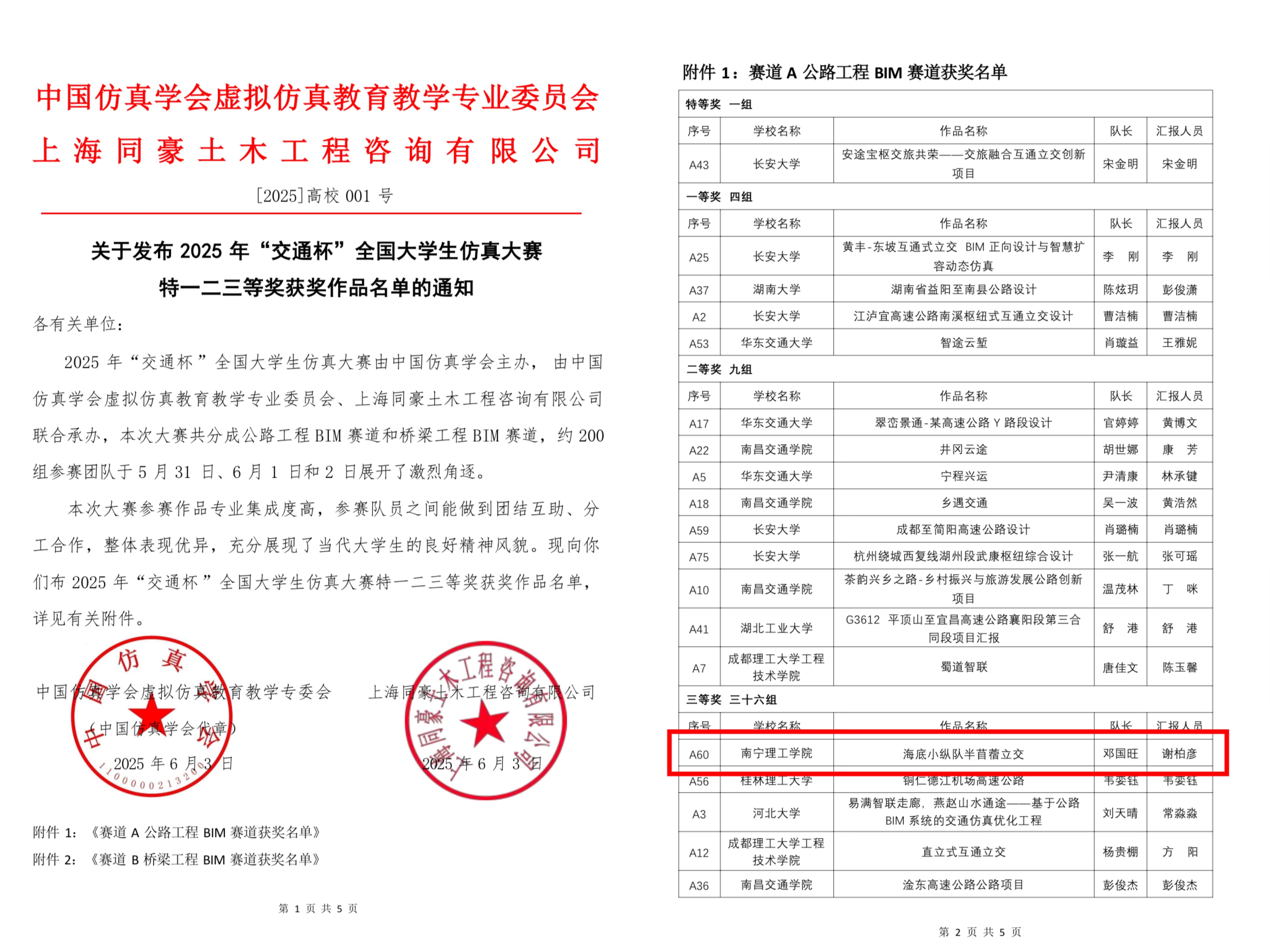 【智瓴土工】喜报!土木与工程学院师生团队在2025“交通杯”全国大学生仿真大赛中再得佳绩!——仿真赛道传捷报,数智育人谱新章
