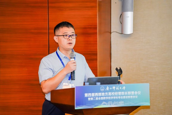 广西师范大学党委常委、副校长宋树祥在致辞中指出,数字经济与千行百业的深度融合正催生新业态、新模式、新产业,为经济社会发展注入新动能。会议通过汇聚多方智慧,不仅为数字经济学科专业建设提供了新思路、新方法,更搭建了校际合作与政产学研协同创新的平台。中国西部研究与发展促进会数字经济专业委员会会长孙启明强调,产教融合是 数字经济发展的重要抓手,高校需立足新一代信息技术、集成电路、智能制造、生物医药、新材料等战略产业需求,优化专业布局,强化人才培养的针对性。咸阳师范学院副校长、西部地方高校经管院长联盟理事会会长姚波则提出,地方高校需肩负服务国家战略与推动学科变革的双重使命,探索新文科背景下经管学科与计算机科学、统计学等学科的交叉融合路径,创新跨校联合培养模式,共建学科创新联合体。