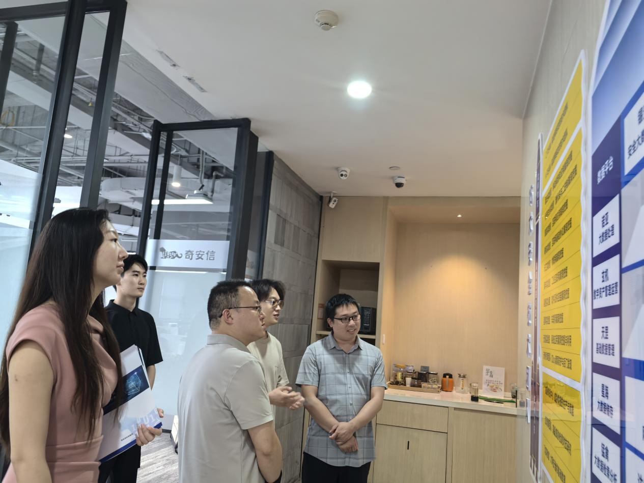 最后,走访团队走进奇安信集团。作为网络安全领域的领军企业,奇安信在网络安全技术研发、人才培养等方面有着深厚积累。在企业负责人的陪同下,学院一行参观了奇安信办公场所,近距离了解网络安全前沿技术与典型应用案例。座谈会上,双方聚焦网络安全人才培养痛点与解决方案展开探讨。王帅书记表示,学院将积极对接企业需求,优化专业课程设置,推动人才培养与产业需求精准匹配,共同为国家网络安全事业输送高素质人才。