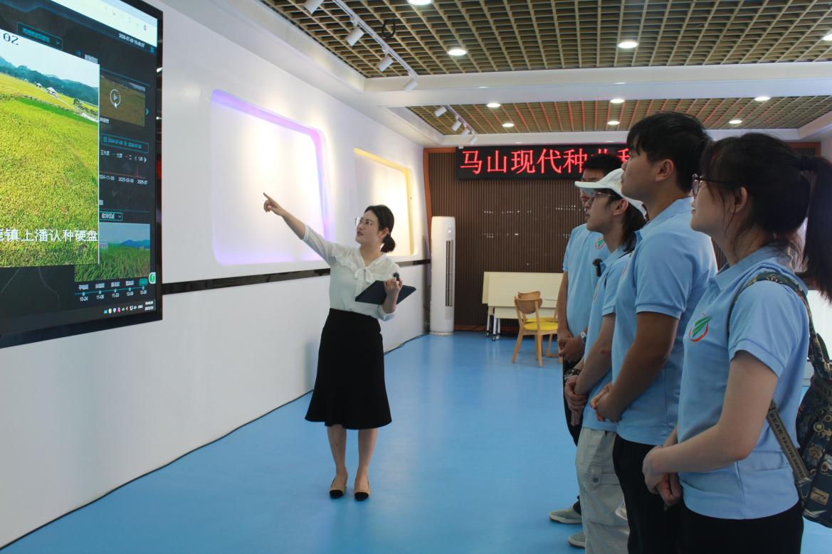 走进马山县现代种业科技创新中心,实践队员们便领悟到什么是“看山不是山,看田亦非田”——屏幕上的数字化智能管理系统与千里之外的农田相连,方寸之间,一键切换,万亩良田跃然而出。马山县制种历史悠久,20世纪80年代当地群众已自发开展选育种活动,并建立地方种质资源库。依托国家生态文明建设示范区的生态优势,因地制宜锚定现代种业新赛道,在国家乡村振兴重点帮扶的科技特派团专家的助力下,实现校地合作,政产学研相结合,探索以种业为驱动、以数智赋能的产业发展新模式,构建“科创—制繁种—产业”良性循环的产业生态。