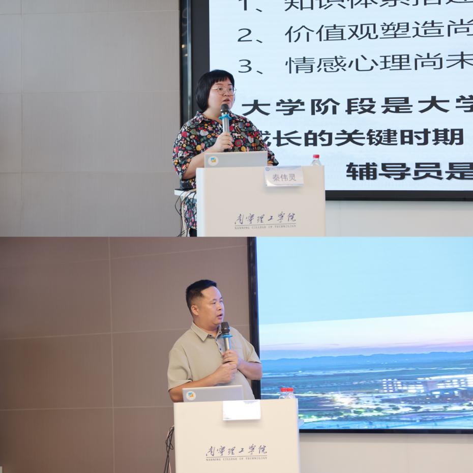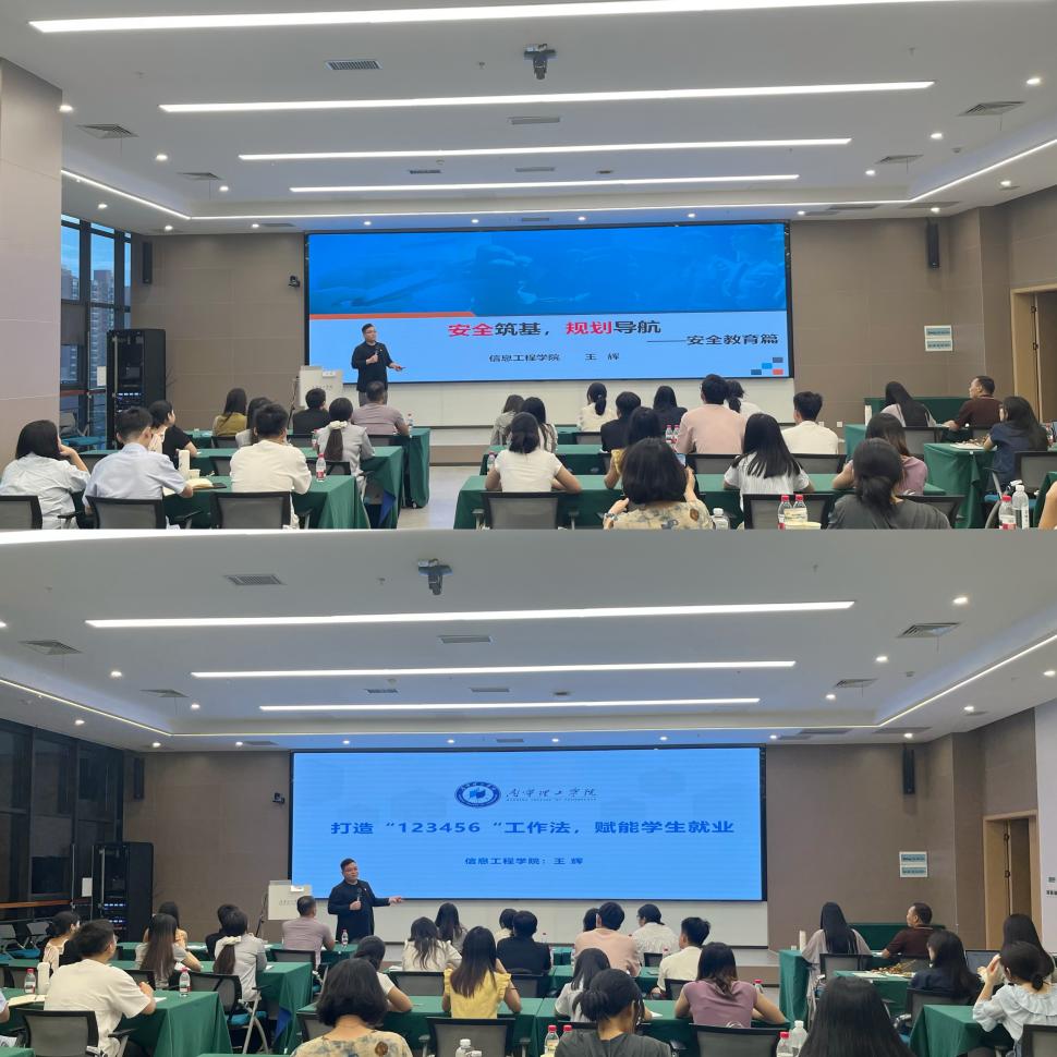 信息工程学院分团委书记王辉立足新时代高校育人工作的战略高度,分别以《安全筑基,规划导航》和《打造“123456”工作法,赋能学生就业》为题,深入浅出地擘画了“就业—安全—心理”三位一体、协同发力的工作范式。结合典型案例,把宏观政策与微观实践无缝衔接,讲述了他对“三全育人”从理念认知到实践落地的探索。土木与工程学院辅导员秦伟灵、信息工程学院党总支书记助理吴正平两位“最美学生工作者”同台开讲,分别以《精细化学生管理-让管理更有温度》和《提灯引路,护航成长》为题,用鲜活故事诠释“润物无声、育人无痕”的初心使命;而辅导员精品主题班会大赛特等、一等、二等奖获得者李欢、张娣、罗超、杨正益四位辅导员轮番登台,通过情景再现、微课展示、互动问答等形式,把一堂堂有高度、有温度、有深度的职业生涯规划主题班会搬上讲台,向大家具体展示了班会育人的生动事例和突出实效。