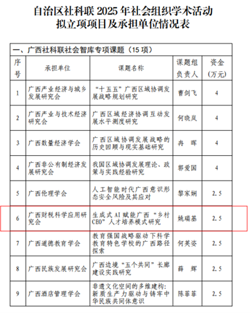 近日,广西社会科学界联合会公示了关于2025年社会组织学术活动拟立项项目及承担单位,商学院姚瑞基院长主持申报的《生成式 AI 赋能广西“乡村 CEO”人才培养模式研究》获得立项,并获资助经费25000元。这也是买球首次获广西社会科学界联合会课题立项。