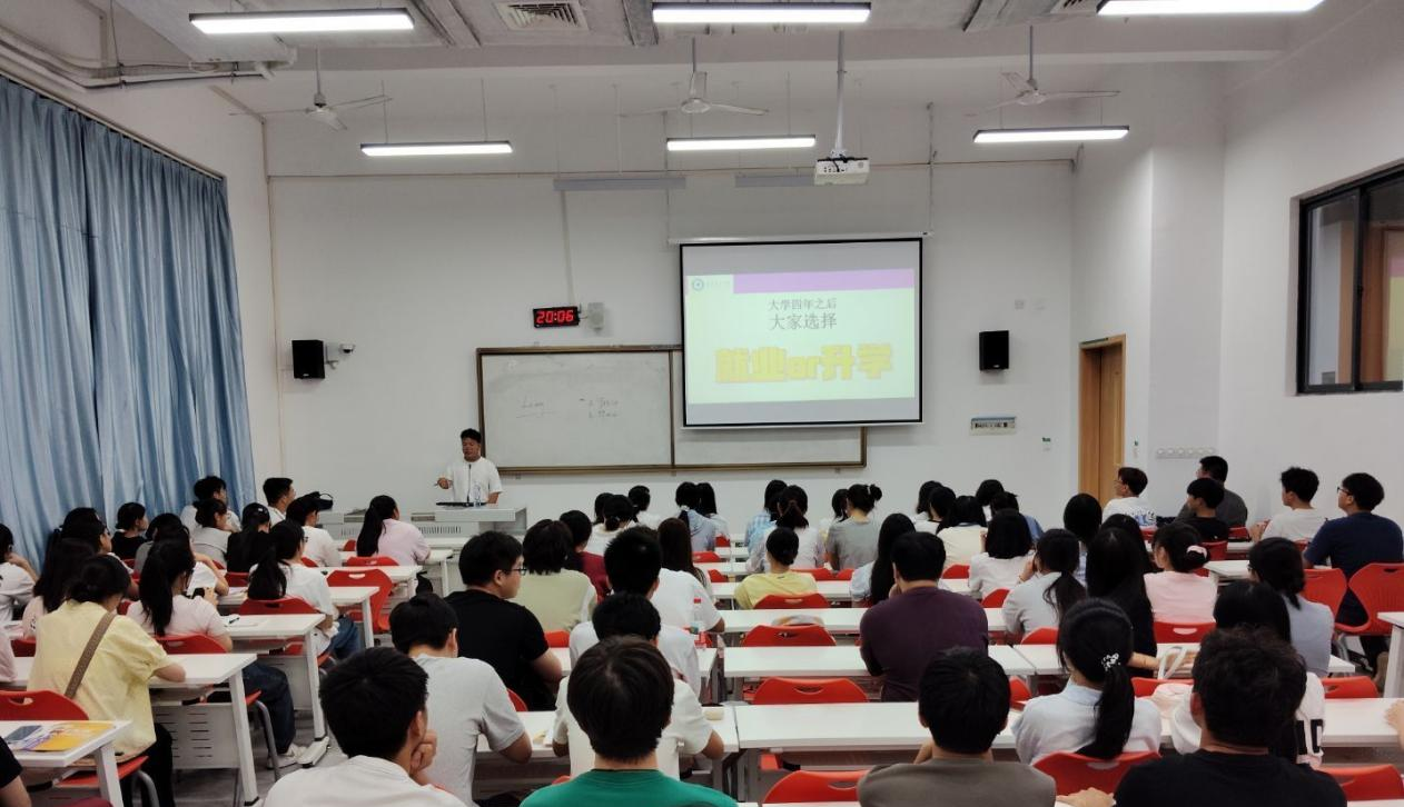 针对新生普遍存在的学业迷茫,班会专门设置 “技能学习与发展规划” 环节,在技能学习方面,班会重点介绍了大学阶段需要掌握的核心能力和学院提供的学习资源。梳理了 “升学 + 就业” 双赛道的赋能资源:升学方面,推荐适合本专业的考研方向、保研政策,以及学校提供的 “考研自习室、学长帮扶计划”;就业方面,列举本专业对应的热门岗位,并介绍可考取的技能证书全方位助力新生的学业成长路径。