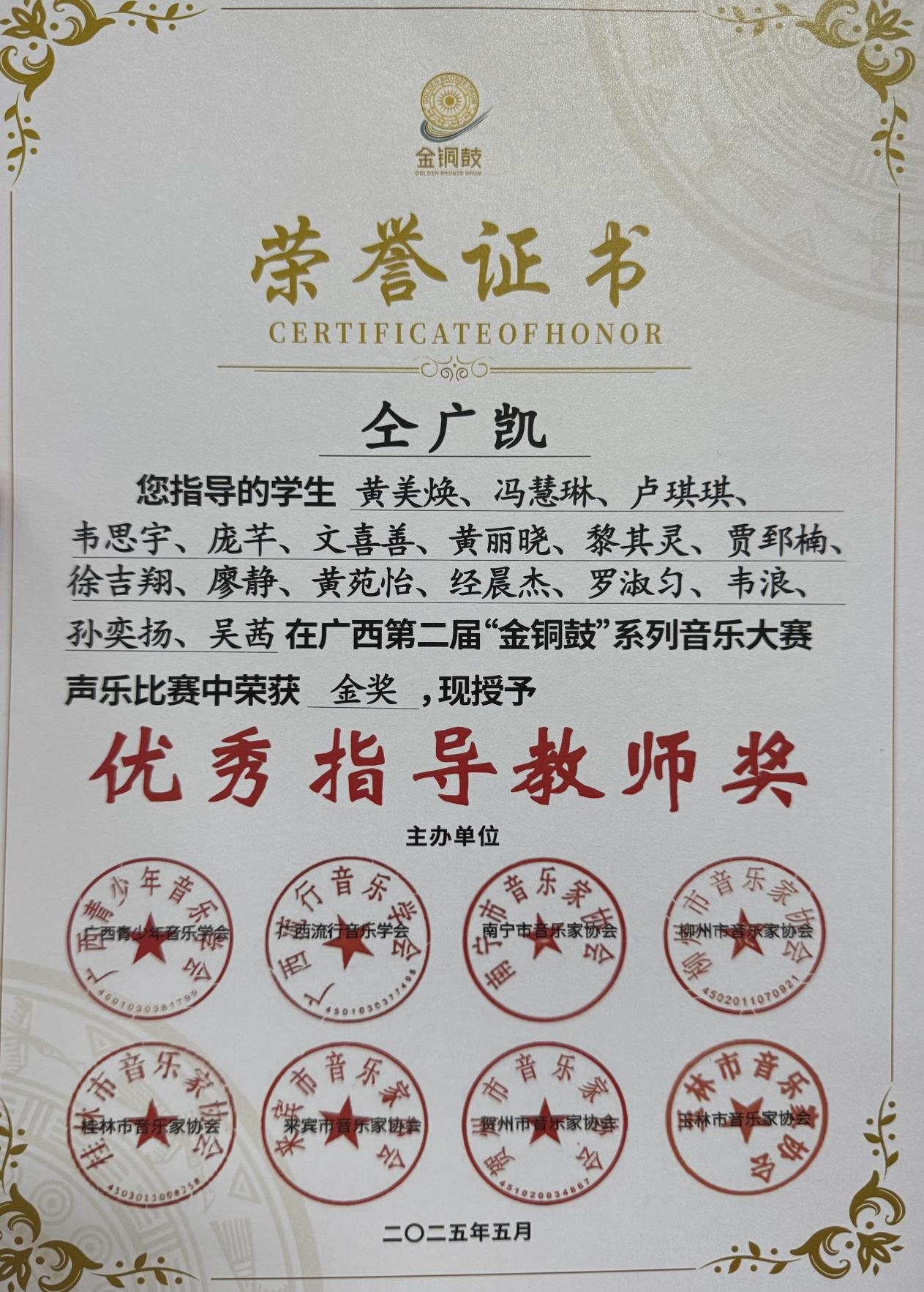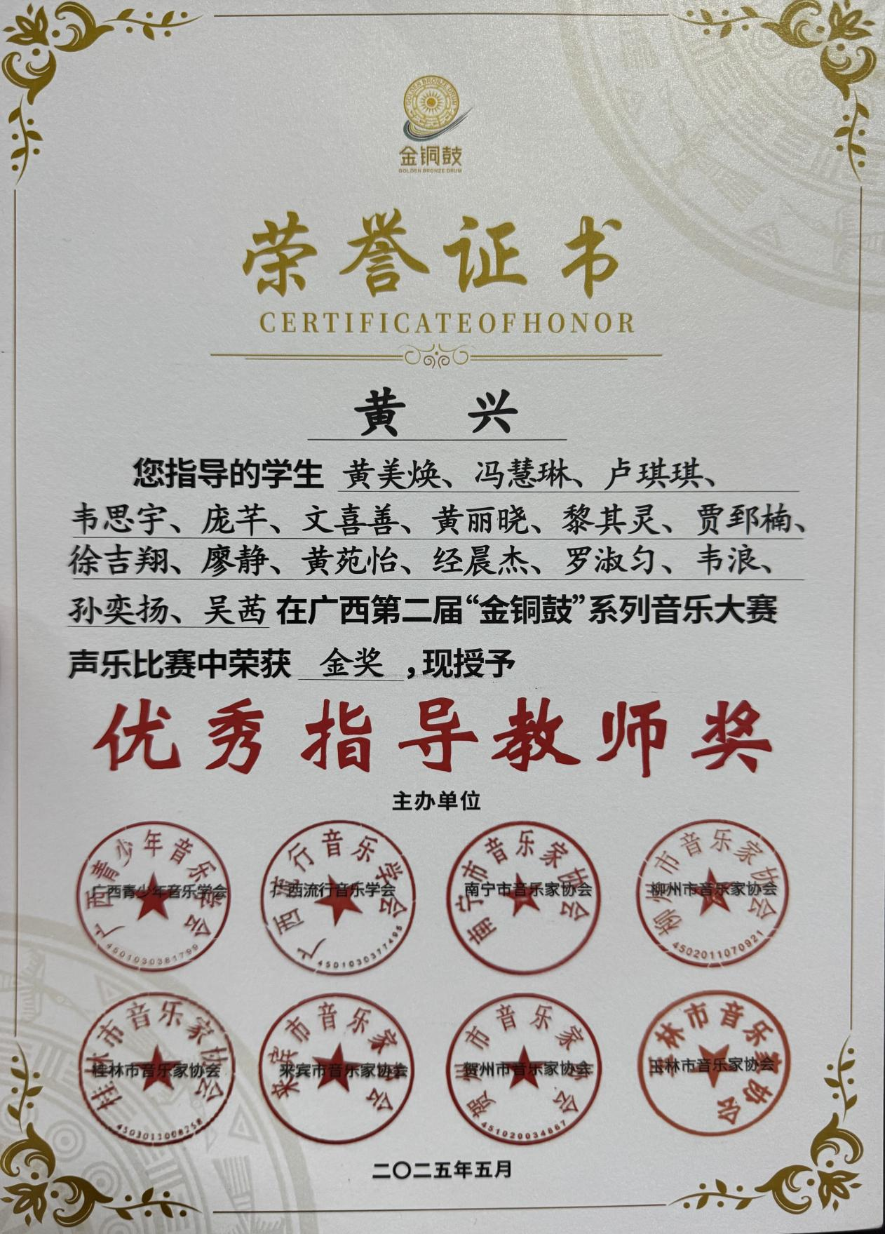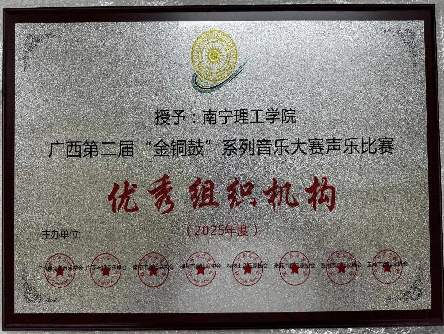 近日,在第二届广西“金铜鼓”系列音乐大赛南宁地区声乐比赛中,买球官方网站文理学院凭借在赛事中的出色组织与卓越表现,荣获“优秀组织机构”称号;学院黄兴、仝广凯两位指导教师,因在赛事指导中展现的专业素养与辛勤付出,双双斩获“优秀指导老师”证书。这两项荣誉的加持,不仅是对学院此前带领学生斩获青年组组合金奖、银奖的再度肯定,更彰显了学院在美育教育领域“以赛促教、以育提质”的扎实成果。