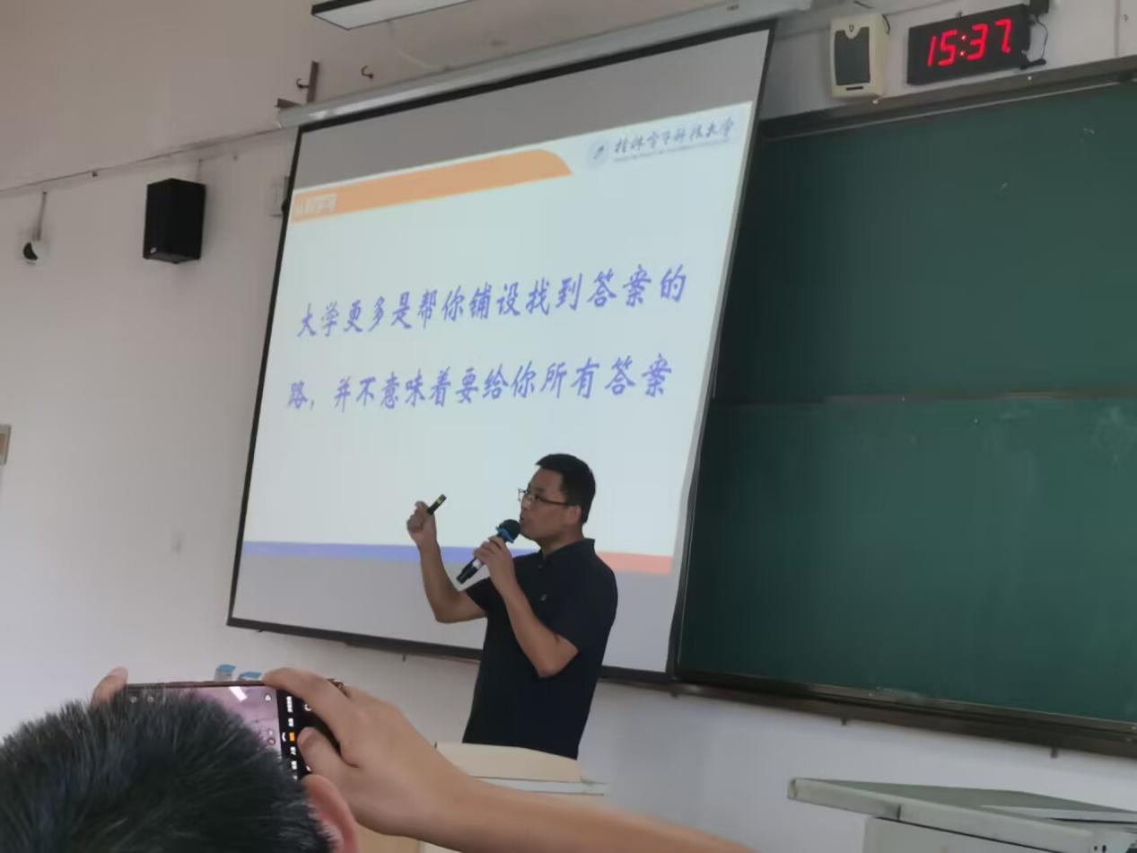 他引用桂电学生案例——孟园园团队研发“智能健康监测背心”并获国家级奖项,强调“大学教育重在铺设寻找答案的路,而非直接提供答案”。