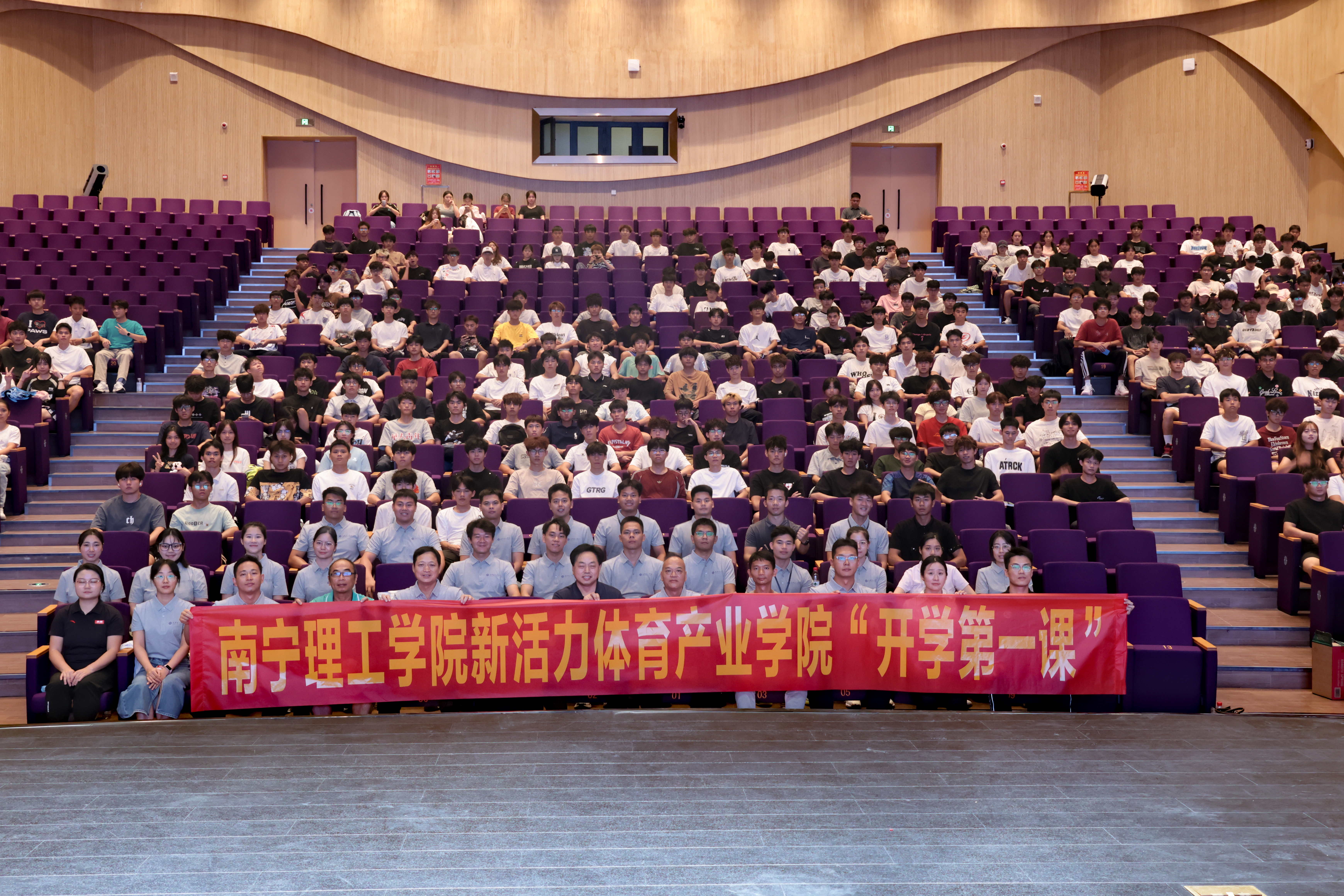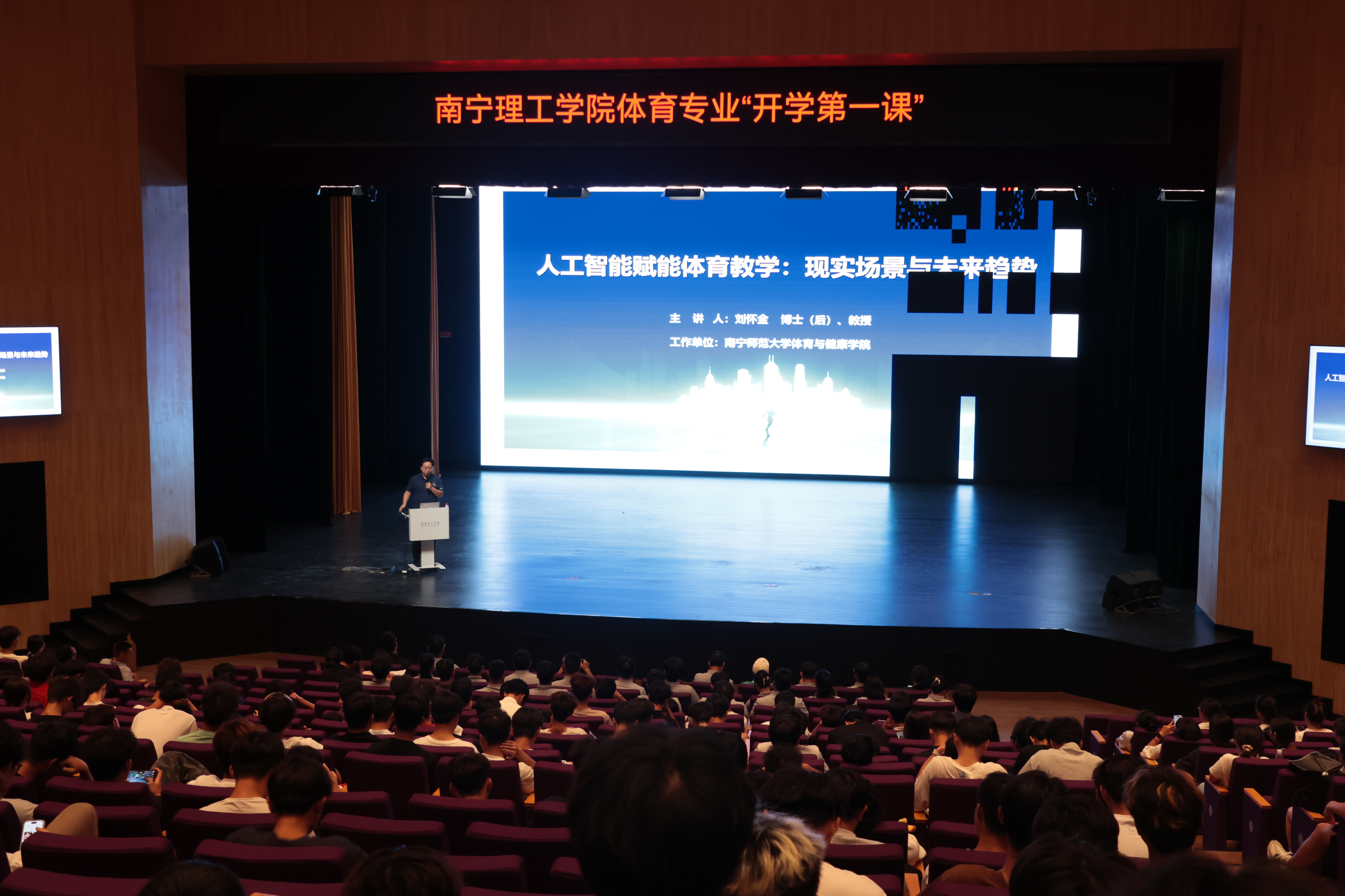 为迎接2025级体育专业新生的到来,助力其积极融入校园生活,明晰专业发展趋势,把握未来职业方向,激发专业学习兴趣,引导学生树立正确的专业观和职业规划。体育专业教研室于9月10日在东盟大剧院举行2025级体育专业新生开学第一课,本次讲座邀请南宁师范大学体育与健康学院刘怀金教授担任主讲,体育专业教研室主任李梅担任专业介绍主讲,全体体育教师参加了本次讲座。此次开学第一课的举办得到了新活力体育产业学院全程支持。